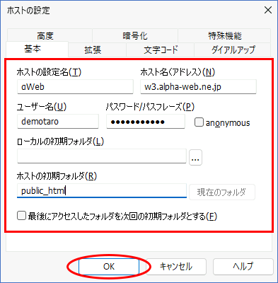 ホストの設定名 任意の名前(例:αWeb)を入力します。 ホスト名(アドレス) 「登録完了のお知らせ」を参照し、「FTPサーバー」を半角文字で入力します。 ユーザー名 「登録完了のお知らせ」を参照し、「FTPログイン名」を半角文字で入力します。 パスワード/パスフレーズ 「登録完了のお知らせ」を参照し、「FTPパスワード」を半角文字で入力します。 anonymous チェックしません。 ローカルの初期フォルダ ご利用のコンピュータのホームページデータを入れてあるフォルダを半角文字で入力します。 ホストの初期フォルダ 「public_html」と半角文字で入力します。 最後にアクセスしたフォルダを次回の初期フォルダとする 次回接続した際に、最初に表示されるディレクトリを今回最後にアクセスしたディレクトリにする場合はチェックします。